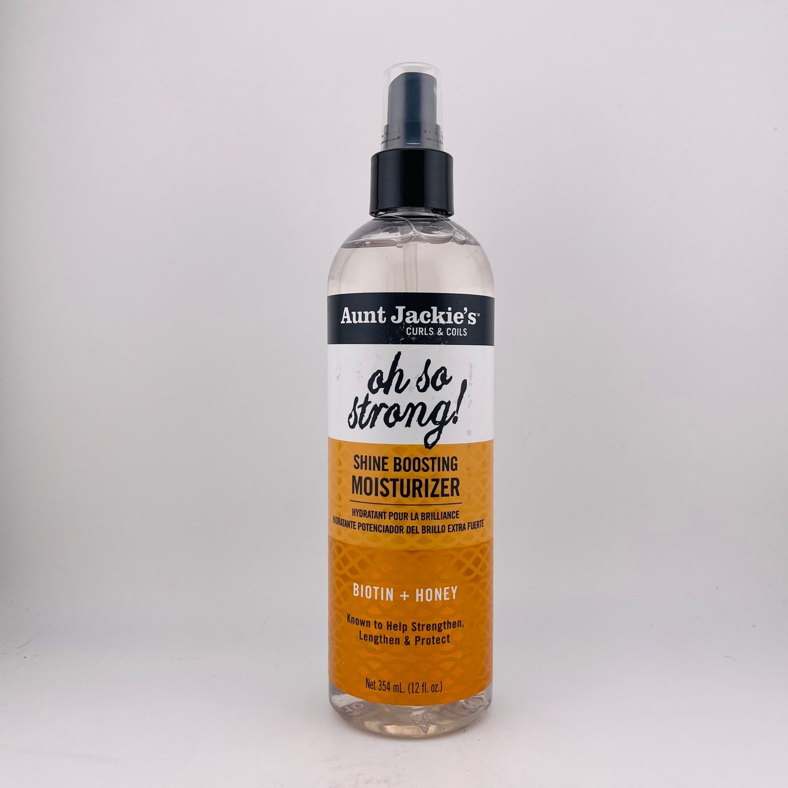 Aunt Jackie’s Braid + Twist Oh So Strong! Shine Boosting Moisturizer is formulated to help maintain moisture, softness, and shine for braids, twists, and loc styles. Enriched with a strengthening and invigorating blend of Biotin, Honey, Rosemary, and Mint, this leave-in moisturizer helps nourish both hair and scalp while enhancing the look of protective styles.