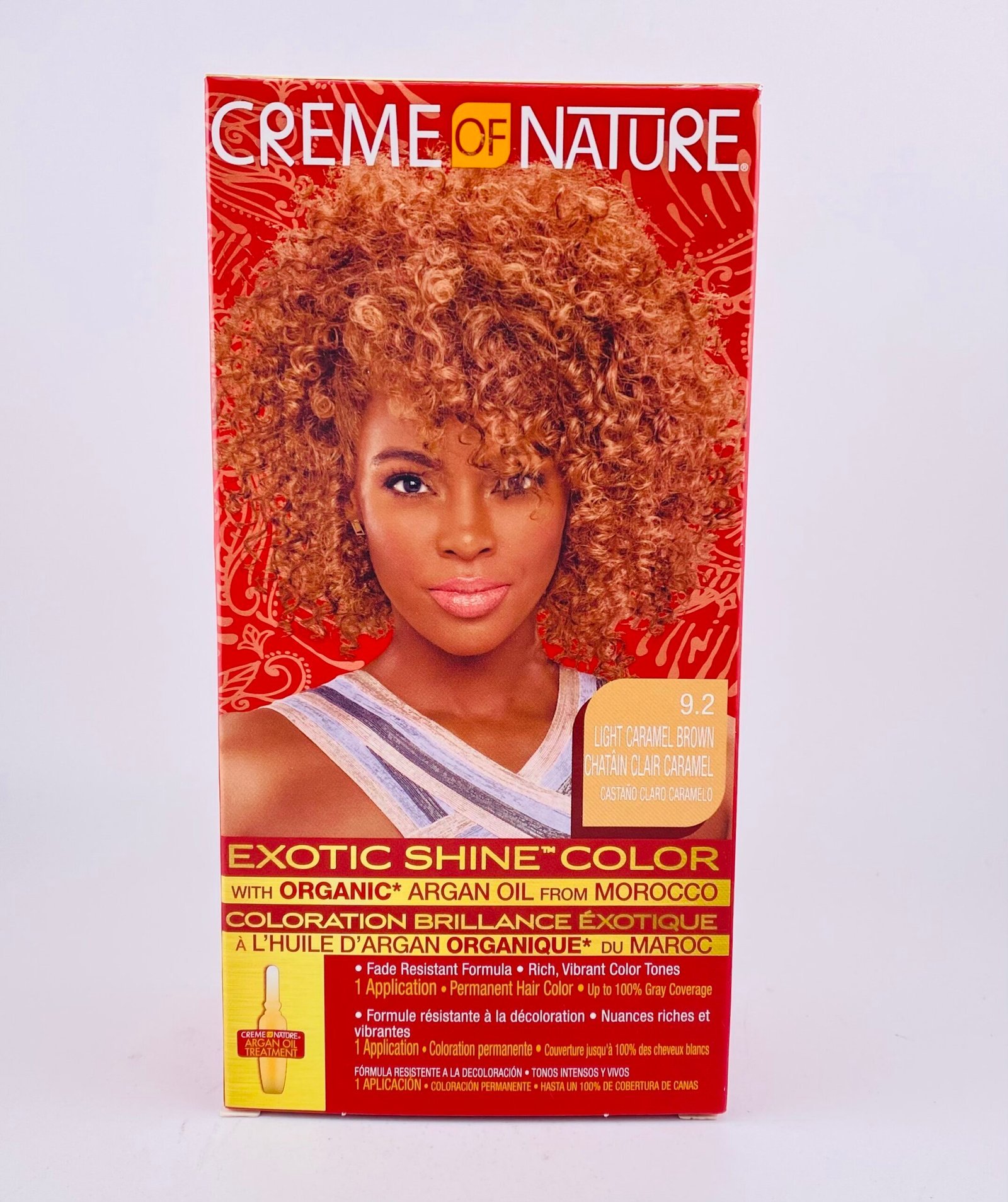 Enhance your style with Creme of Nature 9.2 Light Caramel Brown Permanent Exotic Shine Color. Infused with Argan Oil, this nourishing formula delivers rich caramel brown tones, long-lasting colour, brilliant shine, and excellent grey coverage while keeping hair soft and silky.