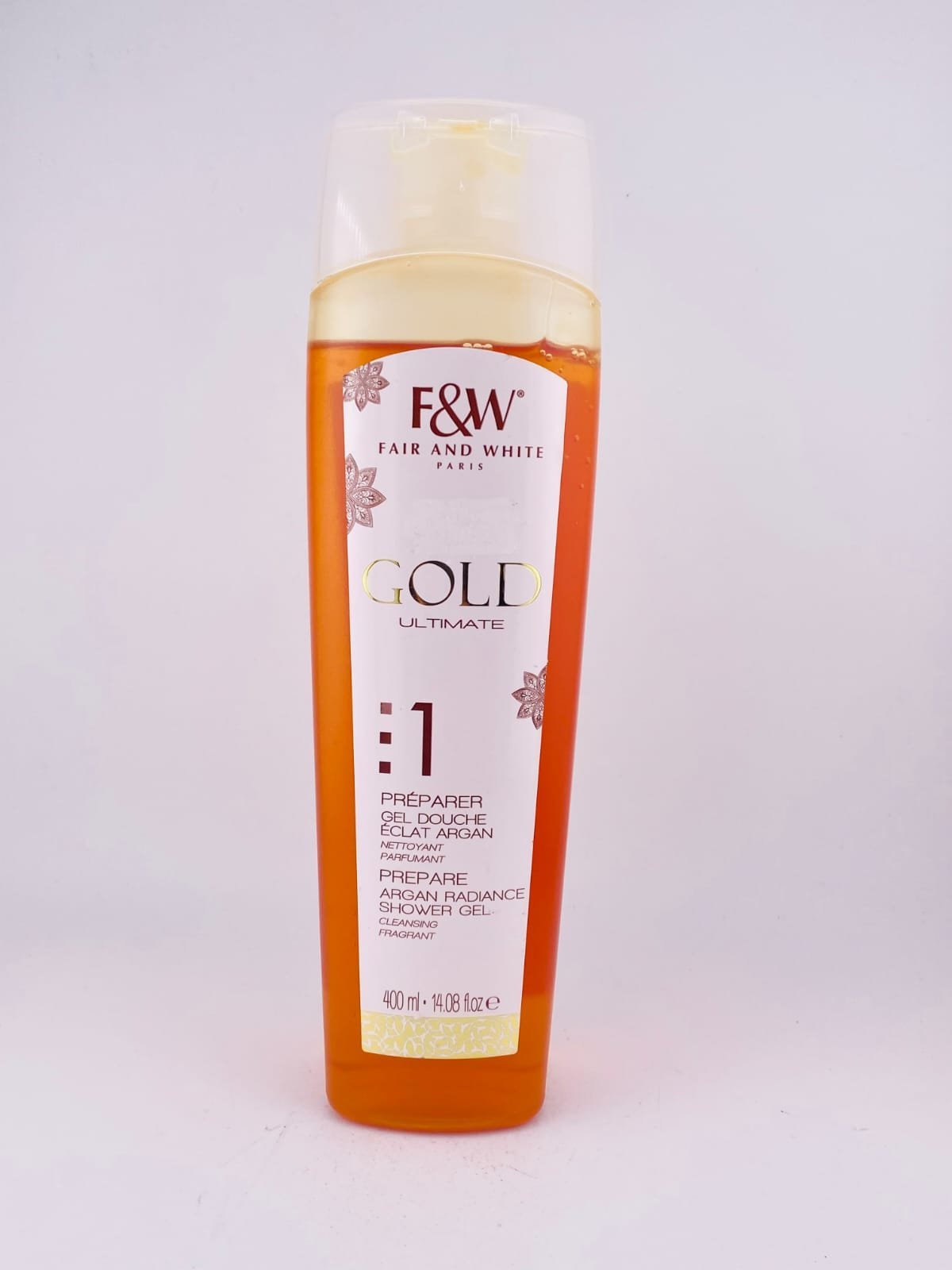 F&W PARIS Gold Ultimate 1 Prepare Argan Radiance Shower Gel (400ml / 14.08 fl oz) is a nourishing body cleanser enriched with argan oil to gently cleanse while hydrating and softening the skin. Its rich, foaming gel removes dirt, impurities, and excess oil without stripping natural moisture, leaving the skin feeling clean, refreshed, and silky smooth. With regular use, it helps support healthier‑looking, radiant skin and makes an uplifting addition to daily shower routines.