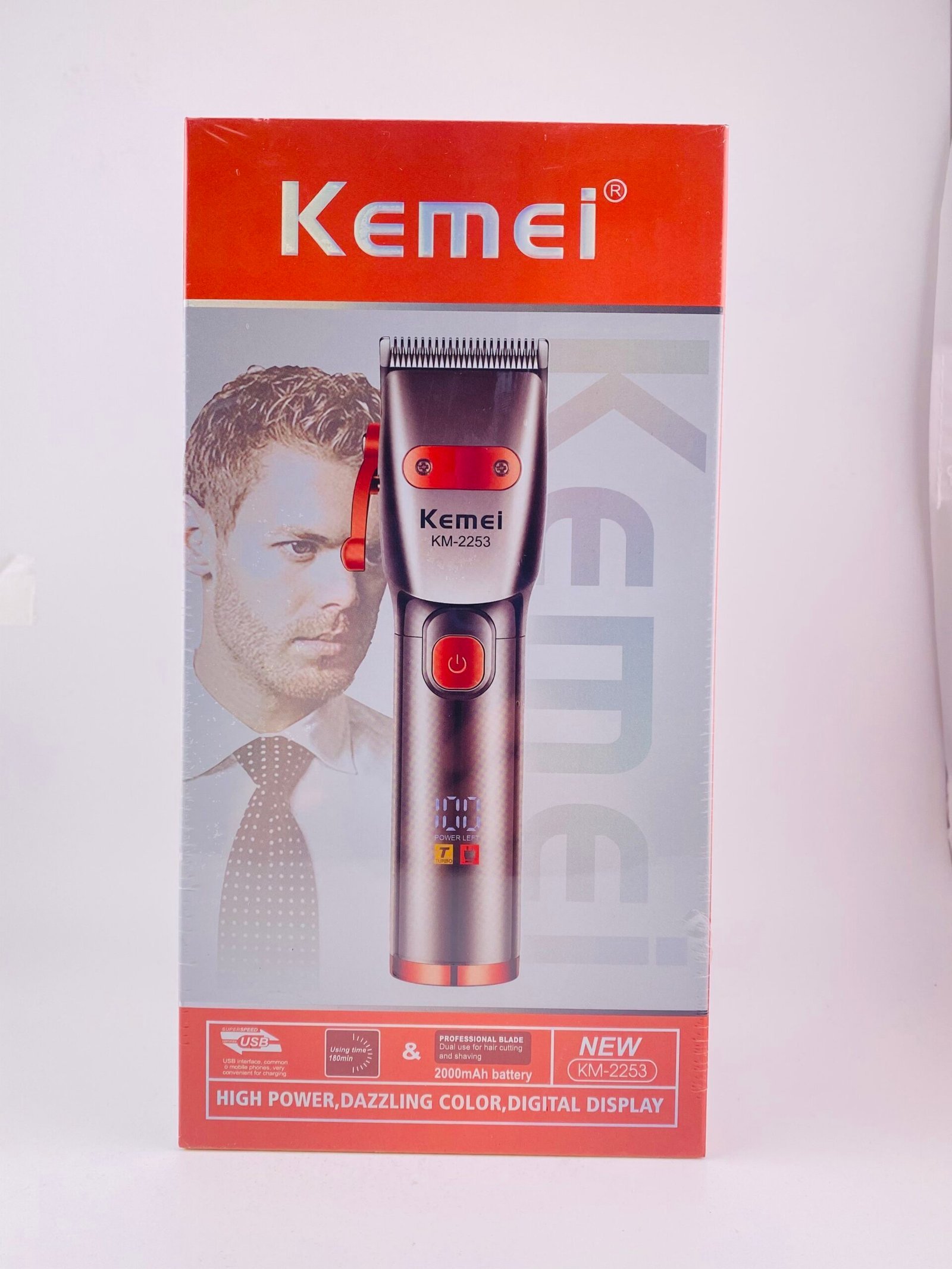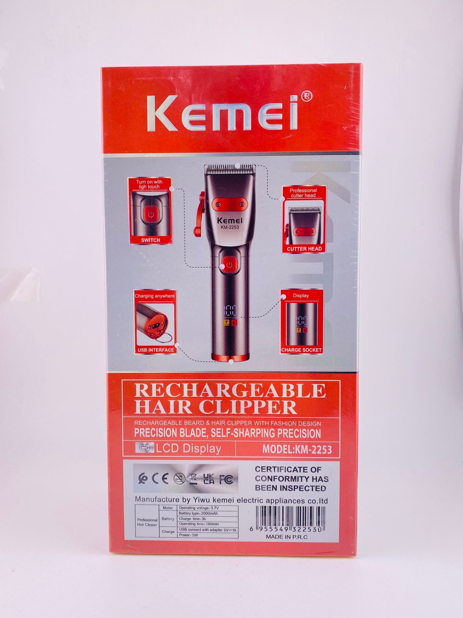 The KEMEI KM-2253 is a cordless, rechargeable hair clipper designed for men that offers professional-style grooming at home or in salons. It features sharp stainless steel cutting blades, a powerful motor with turbo speed for cutting through thick hair, and adjustable clipper settings to customize cutting lengths. The clipper includes a built-in LED display for battery status, a high-capacity rechargeable battery that can run for up to around 3 hours on a full charge, and several guide comb attachments (e.g., 3 mm, 6 mm, 10 mm, 13 mm) to help achieve different hairstyles and beard lengths. Its USB charging makes it convenient for travel and everyday use.