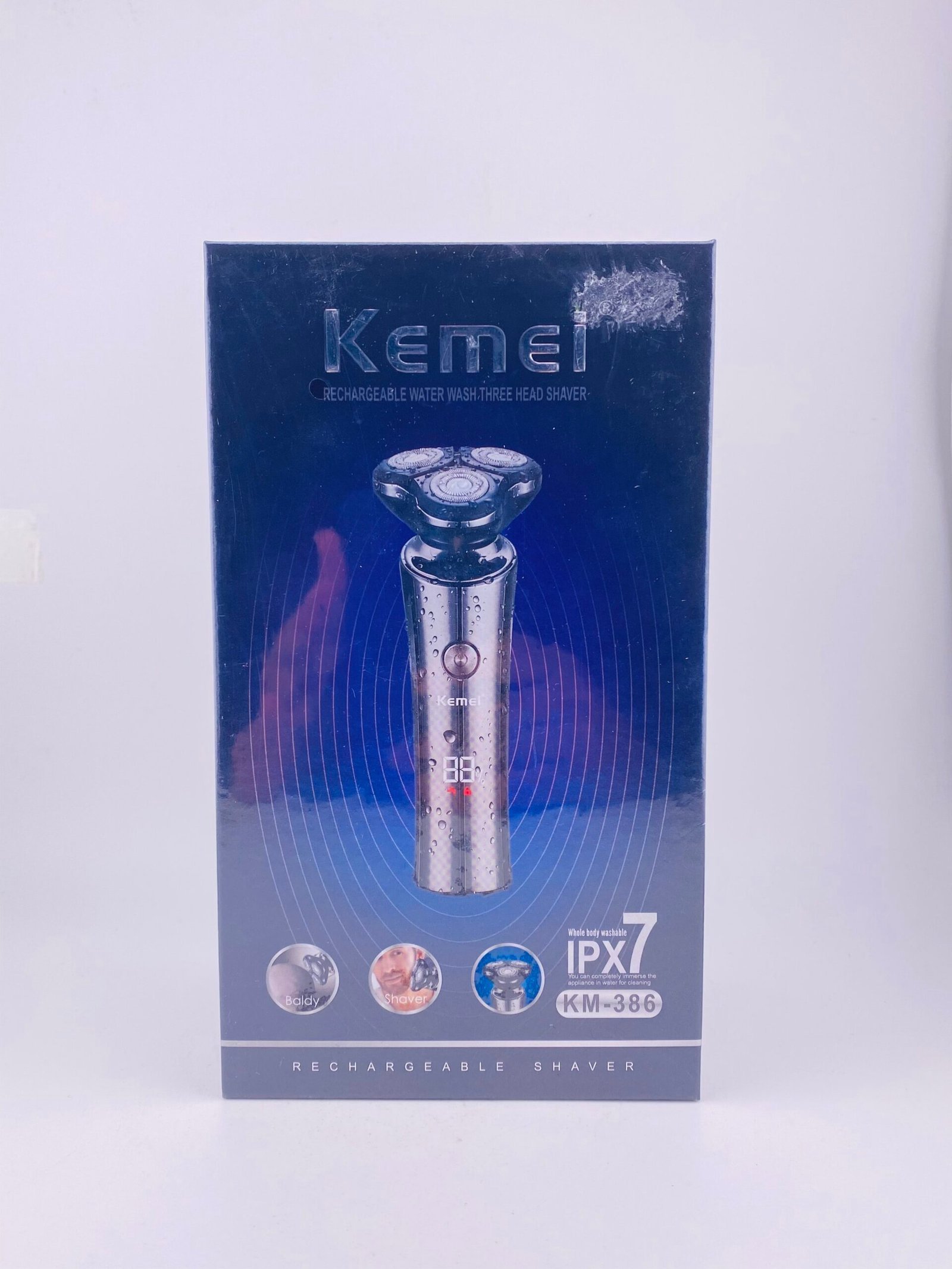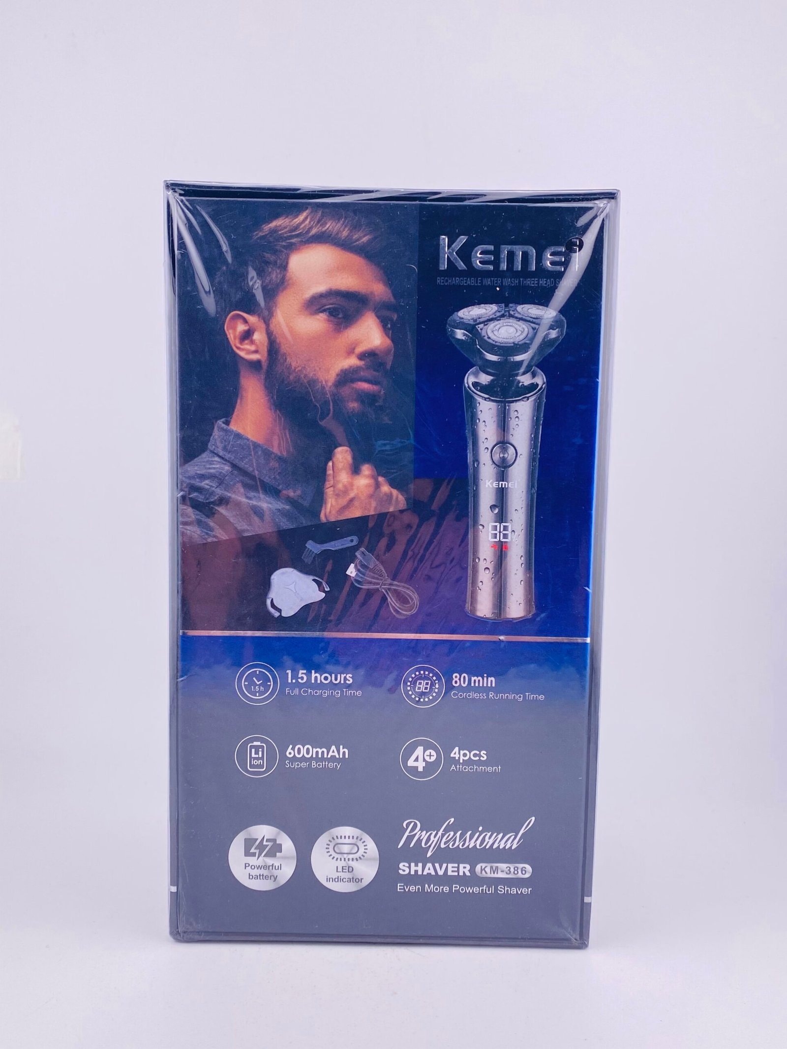 The KEMEI KM-386 is a rechargeable electric shaver designed for men that delivers a smooth and close shave with its multi-head cutting system and 4D floating cutter design, which helps it follow facial contours more easily. It supports USB charging and quick charge for convenience, making it suitable for travel and everyday use. The shaver has an IPX7 waterproof rating, allowing whole-body washing and use in wet or dry conditions, and its heads are removable and washable for easy cleaning. The wider cutting surface increases contact for efficient hair removal, and the overall build aims for strong cutting power with reduced noise.