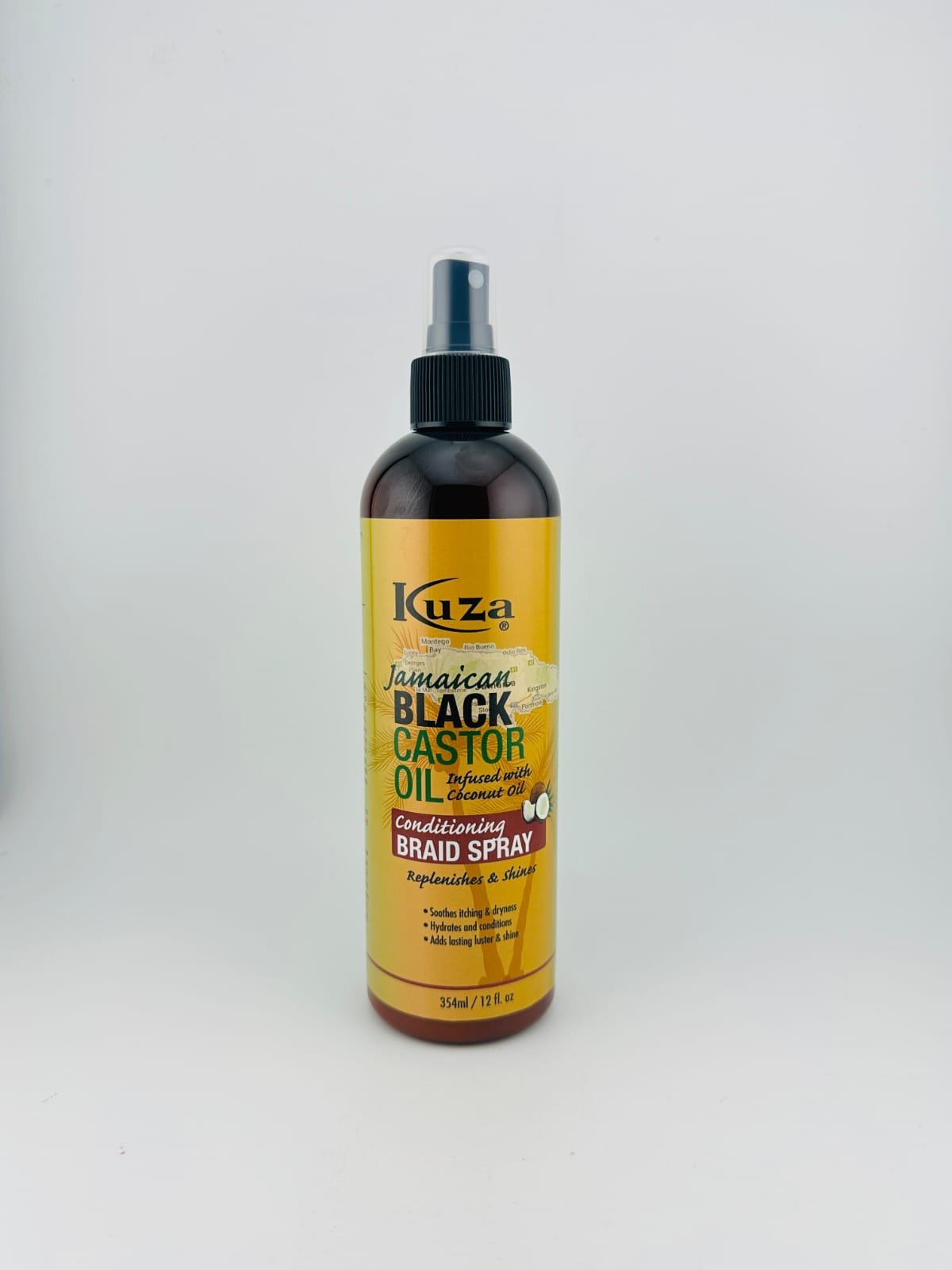 Kuza Jamaican Black Castor Oil Braid Spray is a light, non‑greasy conditioning mist formulated with Jamaican black castor oil, coconut oil, aloe vera juice and argan oil to hydrate, soothe and protect hair and scalp, especially when wearing braids, twists, locs or other protective styles. It helps seal in moisture, reduce dryness and itching, and prevent breakage while adding softness and shine, making hair easier to maintain and style.