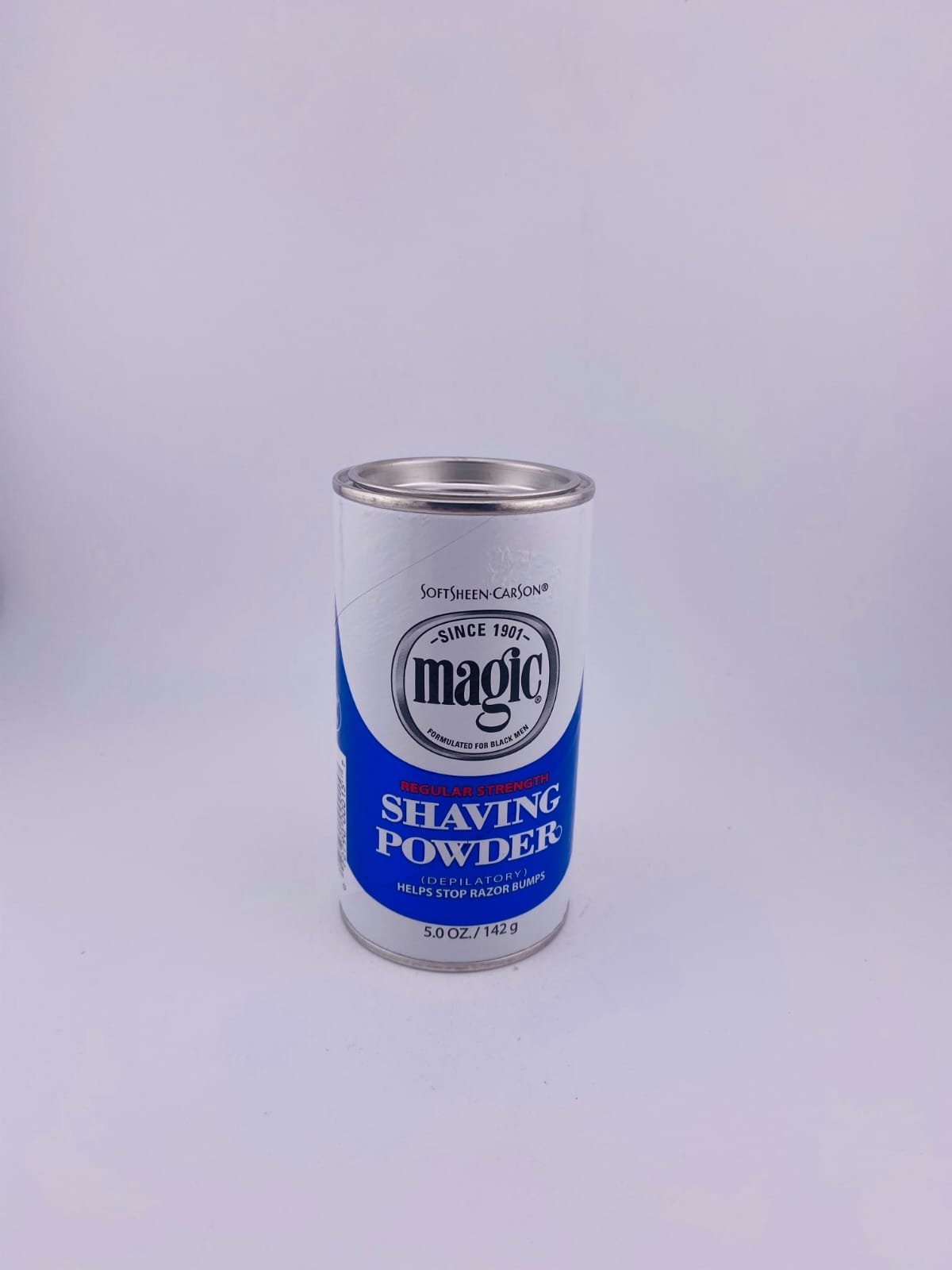 Magic Regular Strength Shaving Powder is a razorless depilatory shaving product that lets you remove facial hair without using a blade. You mix the fine powder with water to make a paste, apply it to the beard area, wait a few minutes, then wipe it off — it chemically dissolves hair for a close, smooth shave that can help reduce razor bumps and irritation compared to traditional razors. It’s formulated with ingredients like corn starch and barium sulfide and has a light fragrance, making it a convenient at‑home grooming option for facial hair removal.