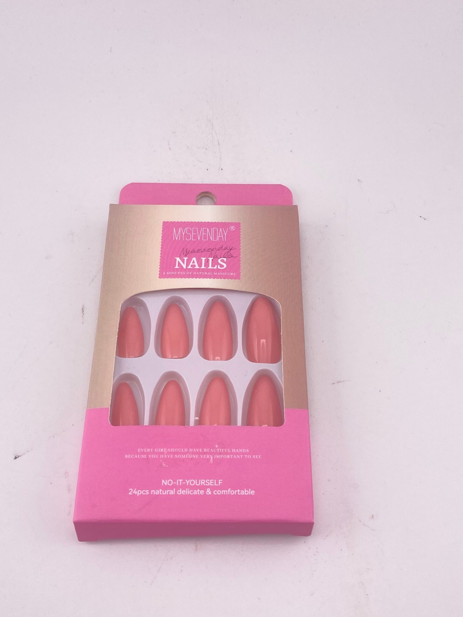 Enhance your manicure with MYSEVENDAY 24 PCS Natural Delicate & Comfortable Nails. These high-quality nails are designed for a natural and elegant look, providing a delicate feel while being durable for all-day wear. Each set includes 24 nails in assorted sizes to fit all fingers, making them perfect for DIY enthusiasts and professional nail technicians. Lightweight, comfortable, and easy to apply, these nails offer a smooth surface for polish or nail art, delivering salon-quality results in minutes. Ideal for everyday wear, special occasions, or creative designs.
