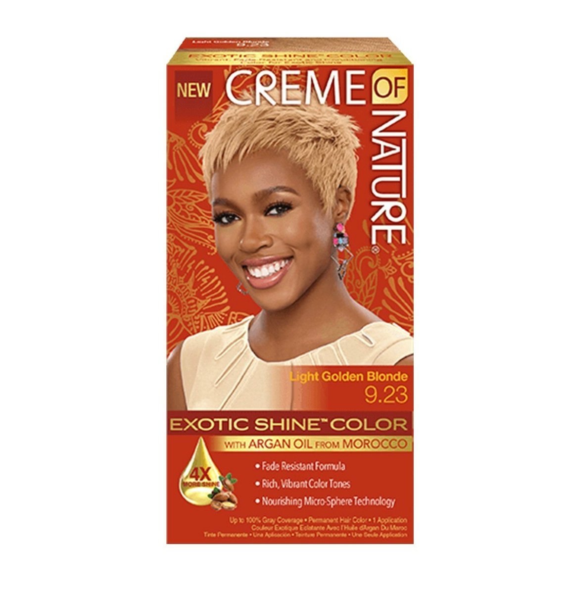 Get a radiant, sun-kissed look with New Creme of Nature Light Golden Blonde 9.23 Permanent Exotic Shine Color. Infused with Argan Oil, this nourishing formula delivers luminous golden blonde tones, long-lasting colour, brilliant shine, and excellent grey coverage.