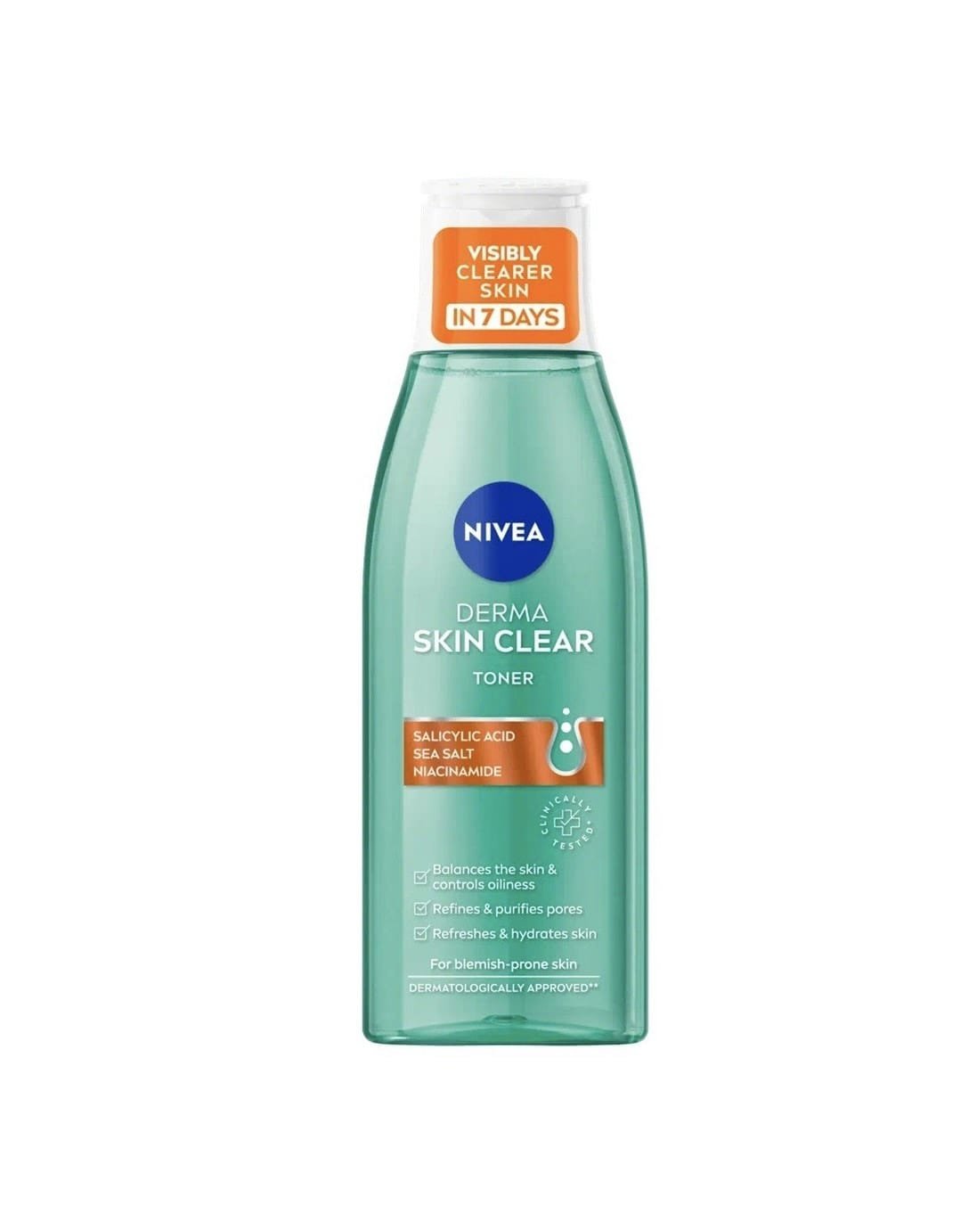 NIVEA Derma Skin Clear Toner with salicylic acid, sea salt, and niacinamide (200 ml / 8.2 fl oz) is a refreshing facial toner that helps remove leftover impurities after cleansing while gently exfoliating and unclogging pores. The salicylic acid works to clear excess oil and reduce blemishes, sea salt offers mild physical exfoliation, and niacinamide supports a more even skin tone. With regular use, it leaves skin feeling clean, smoother, and more balanced.