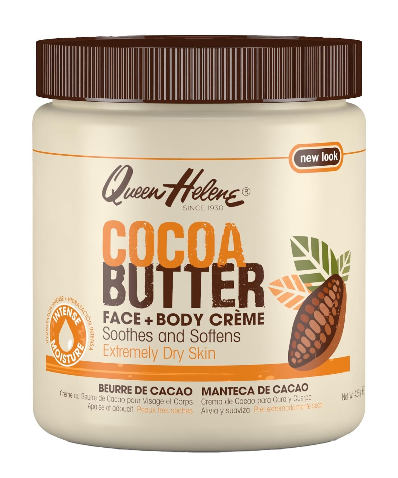 Queen Helene Cocoa Butter Face + Body Crème (425 g / 15 fl oz) is a rich, moisturizing cream formulated with cocoa butter to deeply nourish and hydrate both face and body skin. It helps soften and smooth dry, rough areas while supporting skin’s natural moisture balance. Its creamy texture absorbs well, leaving the skin feeling supple, conditioned, and refreshed with regular use. Suitable for daily hydration and all skin types.