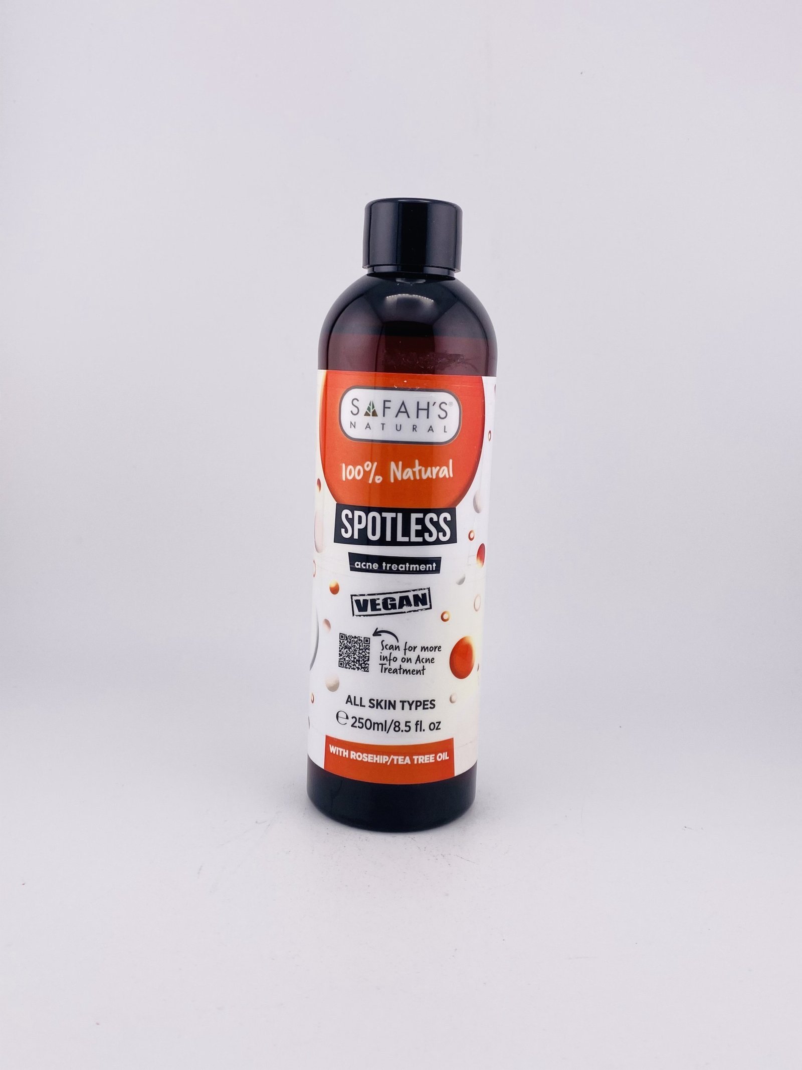 SAFAH’S 100% Natural SPOTLESS Acne Treatment VEGAN (250 ml / 8.5 fl oz) is a plant‑based, all‑natural skin treatment designed to help clear and prevent acne breakouts. It’s formulated as a lightweight, fast‑absorbing natural oil blend that targets acne‑causing bacteria, helps reduce redness and inflammation, and keeps pores clear without harsh chemicals. The formula uses pure botanical oils and extracts that soothe irritated skin while working to improve overall complexion, making it suitable for daily use on acne‑prone skin.