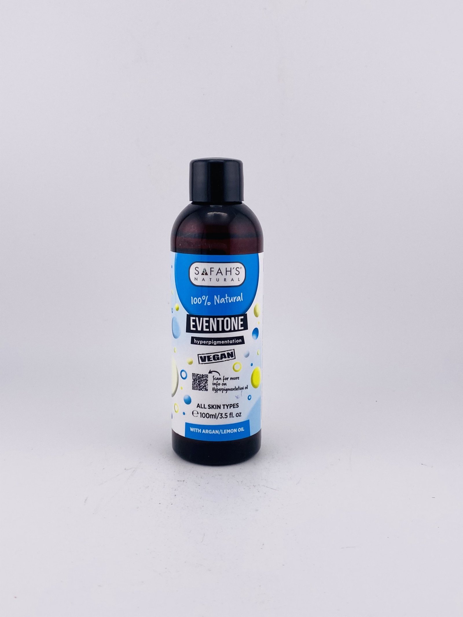 SAFAH’S NATURAL 100% Natural EVENTONE VEGAN (100 ml / 3.5 fl oz) is a vegan, all‑natural skin oil treatment formulated to help even out skin tone and reduce the appearance of dark spots and hyperpigmentation using plant‑derived ingredients like lemon oil for brightness and argan/rosehip oils for deep nourishment. Its lightweight, non‑greasy formula aims to support a more radiant, balanced complexion and can be used as part of a daily skincare routine for more even‑looking skin.