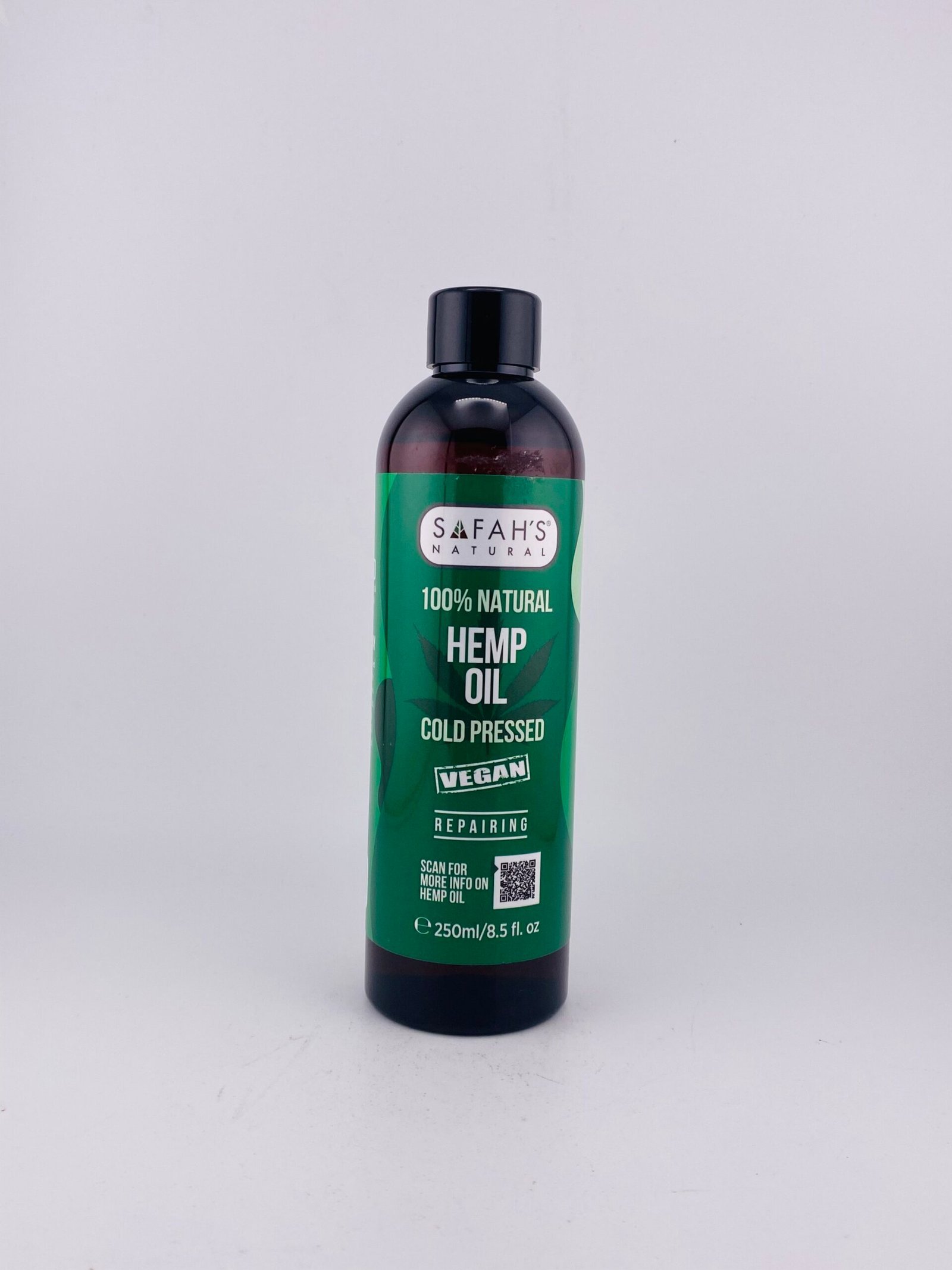 SAFAH’S Natural 100% Hemp Oil (Cold-Pressed, Vegan, 250 ml / 8.5 fl oz) is a pure, plant-based oil extracted from hemp seeds without heat to retain its nutrients. It has a nutty aroma and is commonly used for skin, hair, and dietary wellness. Vegan and natural, it’s rich in omega fatty acids, promoting hydration, nourishment, and overall health. The 250 ml size is suitable for regular use.