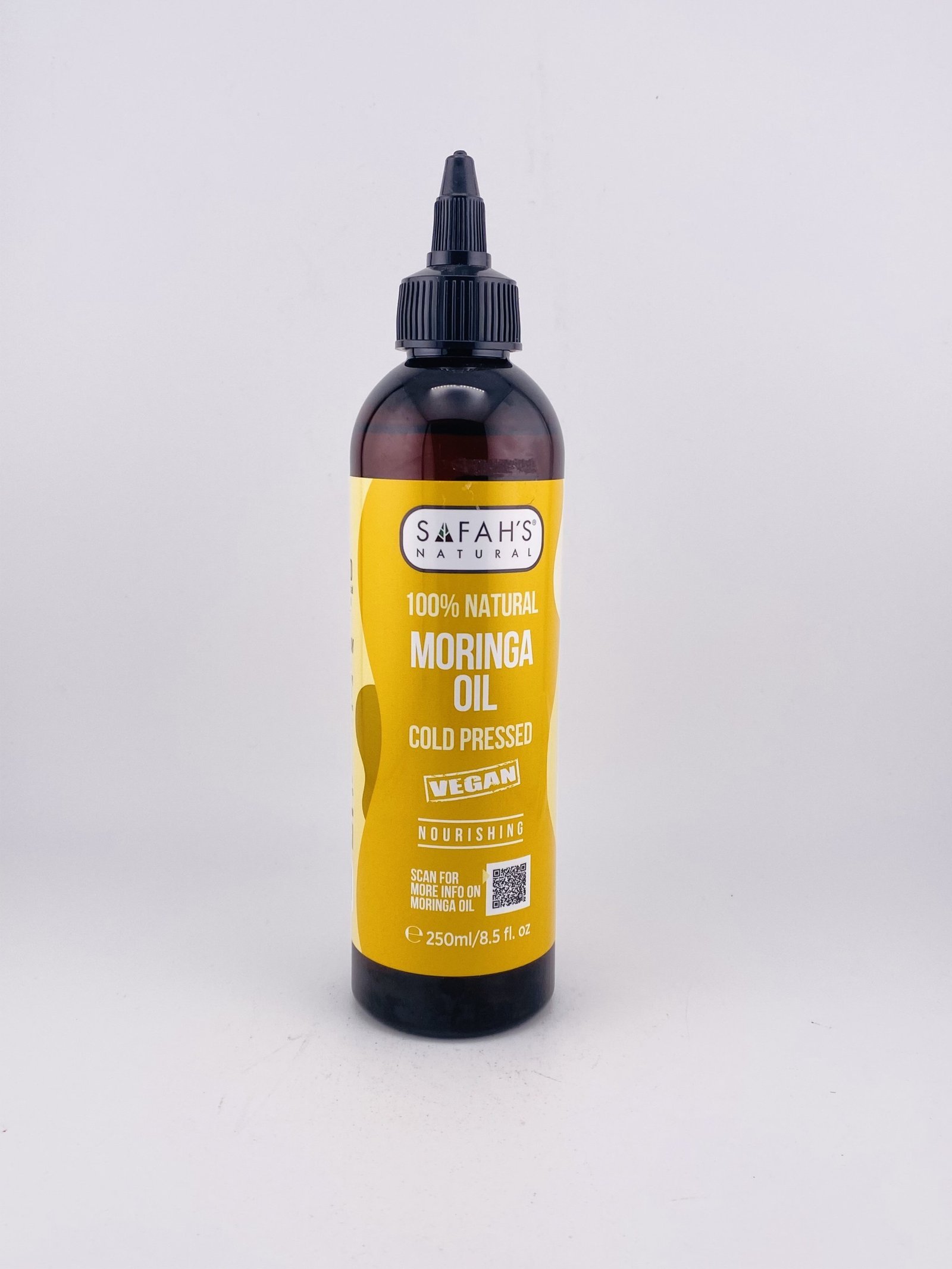 SAFAH’S NATURAL 100% Natural Moringa Oil Cold Pressed VEGAN (250 ml / 8.5 fl oz) is a vegan, all‑natural cold‑pressed oil extracted from moringa seeds. It’s rich in antioxidants, vitamins, and nourishing fatty acids that help deeply moisturize skin, support a healthy scalp, improve hair strength and shine, and promote overall skin and hair wellness. Its cold‑pressed method preserves nutrients for effective natural beauty and self‑care use without synthetic additives.