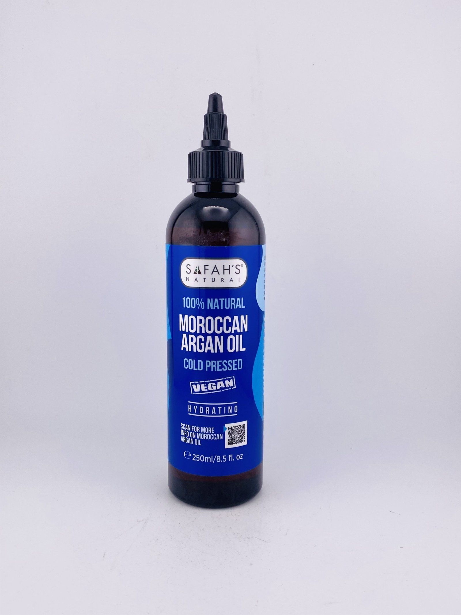 SAFAH’S NATURAL 100% Natural Moroccan Argan Oil Cold Pressed VEGAN (250 ml / 8.5 fl oz) is a vegan, all‑natural cold‑pressed beauty oil sourced from Moroccan argan kernels that retains its rich nutrients and antioxidants thanks to gentle extraction. It’s lightweight with a mild nutty scent and widely used to nourish and hydrate both skin and hair. For hair, it helps boost shine, smooth frizz, strengthen strands, and support scalp health; for skin, it moisturizes dry areas, helps reduce the appearance of scars and stretch marks, and supports a more radiant, youthful complexion — all without synthetic additives.