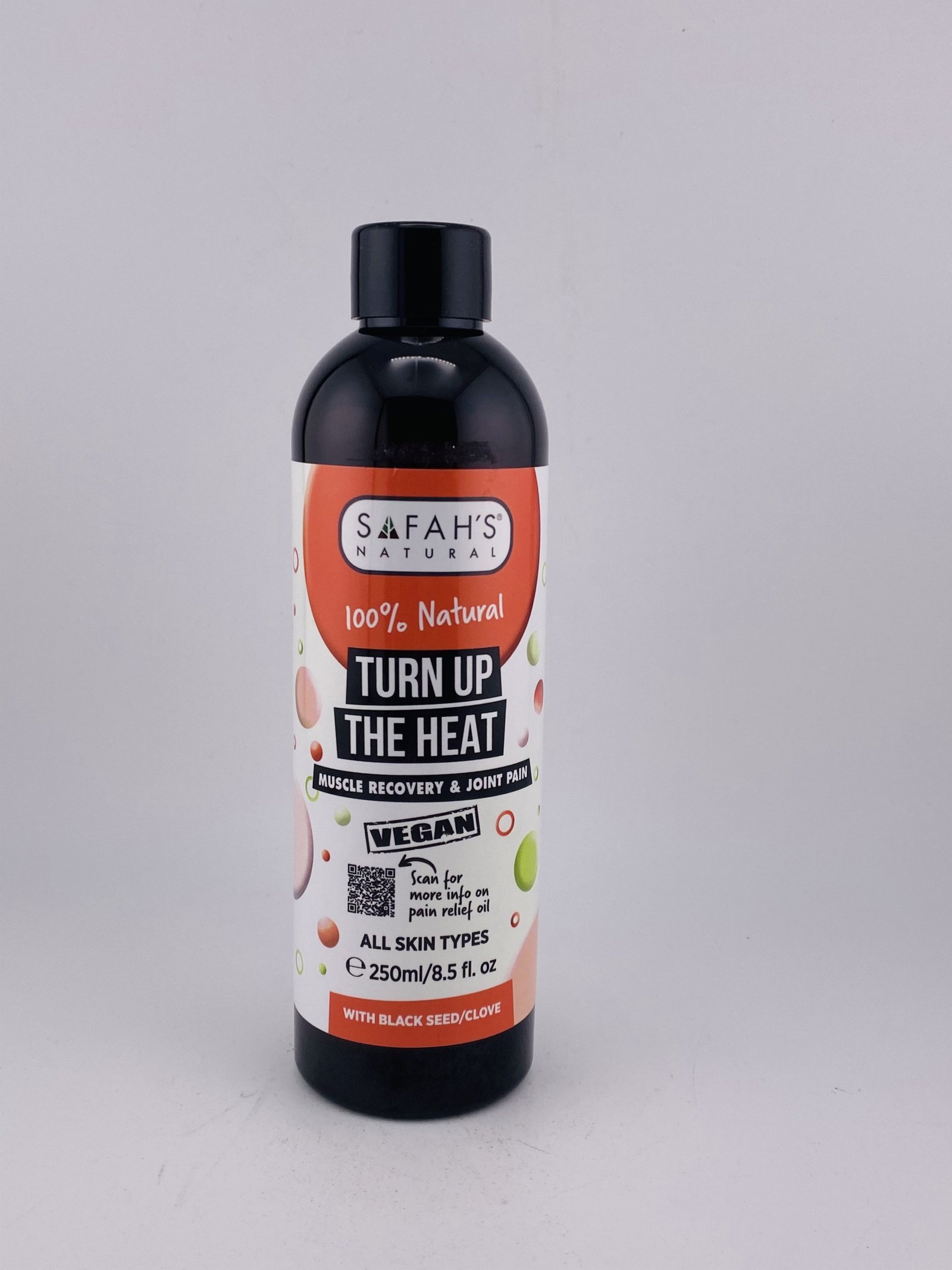 SAFAH’S NATURAL 100% Natural TURN UP THE HEAT VEGAN (250 ml / 8.5 fl oz) is a plant-based, vegan-friendly body and massage oil designed to stimulate circulation and provide a warming, invigorating sensation. Made from 100% natural ingredients, it helps relax muscles, soothe tension, and energize the skin without any synthetic additives. Its lightweight texture allows for easy absorption, making it suitable for daily use in self-care or massage routines.