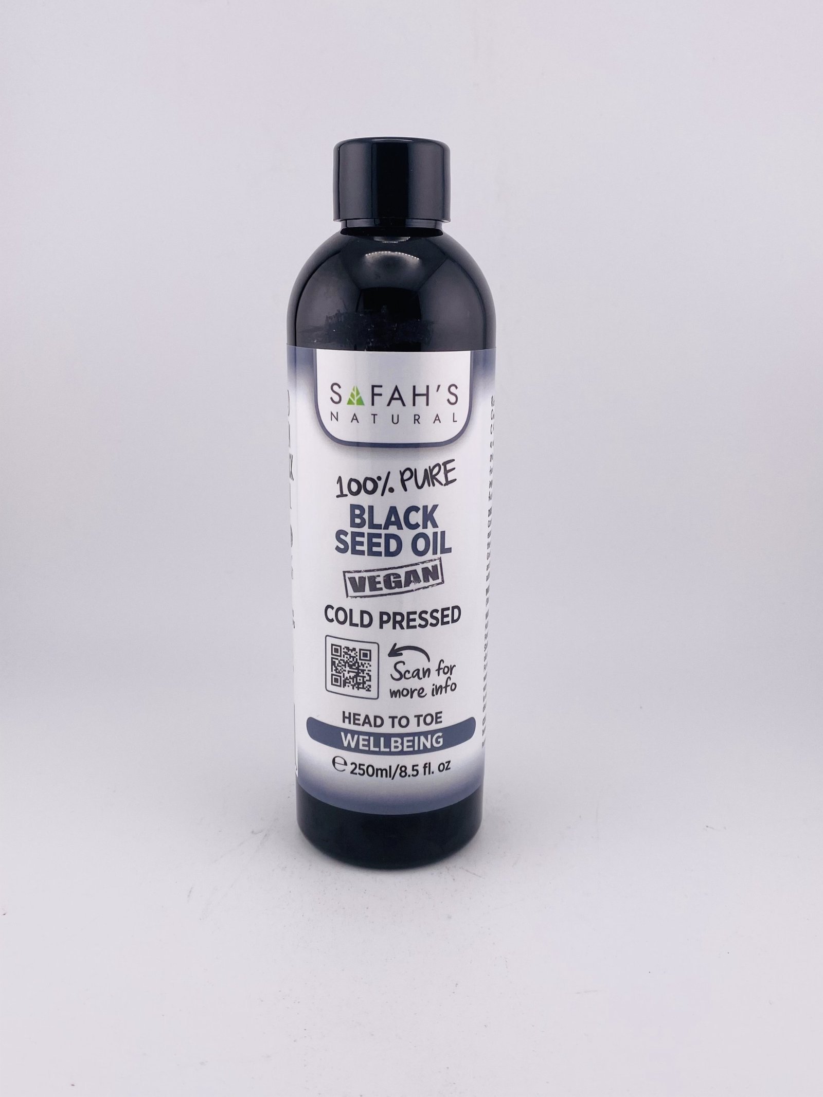 SAFAH’S NATURAL 100% Pure Black Seed Oil Cold Pressed (250 ml / 8.5 fl oz) is a vegan‑friendly, all‑natural cold‑pressed botanical oil extracted from Nigella sativa (black cumin) seeds. It’s rich in antioxidants, vitamins and fatty acids that help nourish skin and hair, support a healthier scalp and stronger hair growth, and can be used topically in beauty and wellness routines. Renowned for its traditional skincare and therapeutic uses, this multi‑purpose oil helps soothe inflammation, improve skin texture, and offer natural conditioning benefits without synthetic additives.