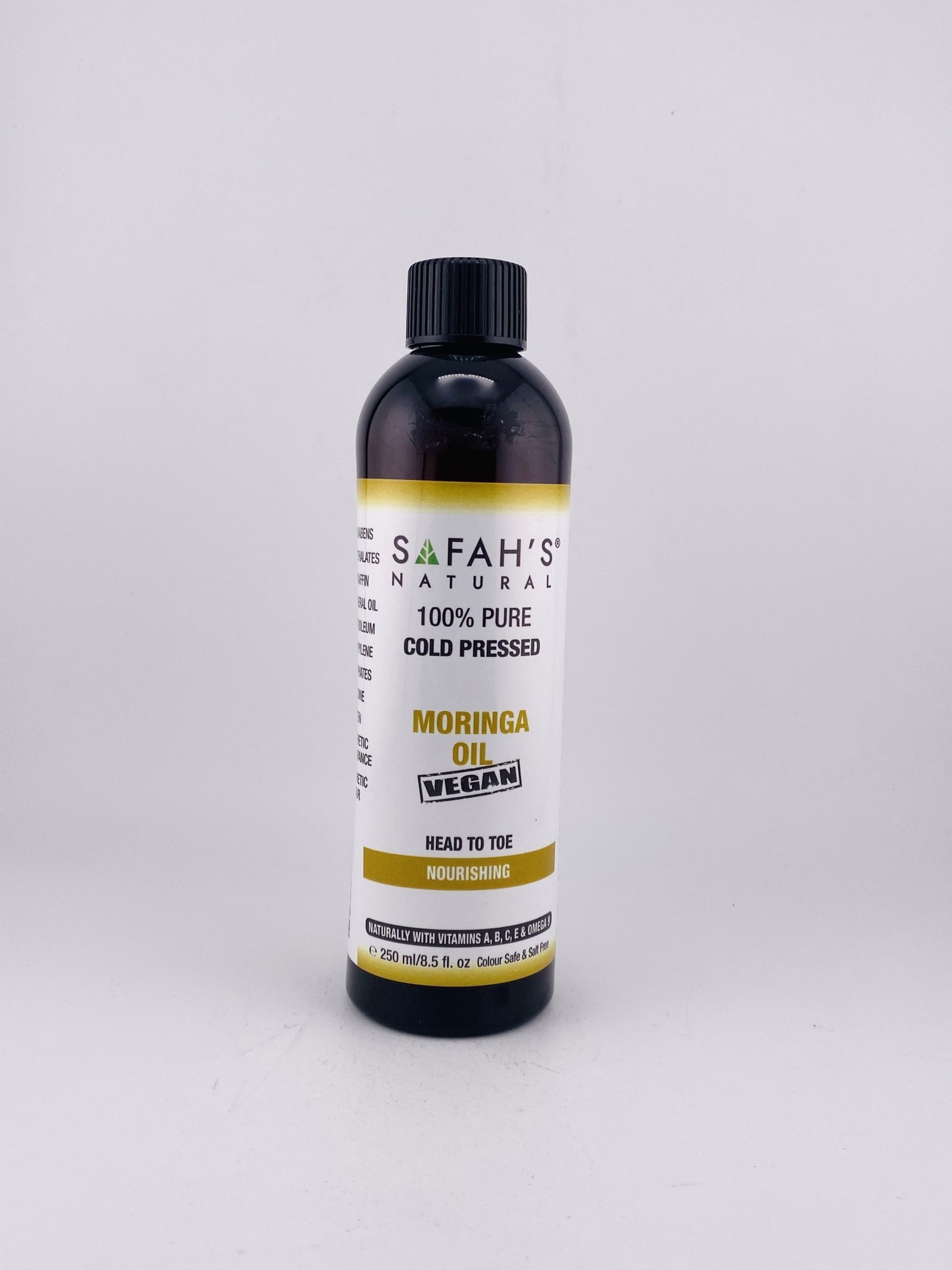 SAFAH’S NATURAL 100% Pure Cold Pressed Moringa Oil VEGAN (250 ml / 8.5 fl oz) is a vegan, all‑natural cold‑pressed oil made from the seeds of the Moringa tree. It’s rich in nutrients, antioxidants and vitamins that help deeply nourish and moisturize skin and hair, support a healthy scalp, improve shine and texture, and can also help with dryness and signs of aging. Because it’s cold‑pressed and unheated, the oil retains its beneficial compounds for effective natural skincare and hair care use.