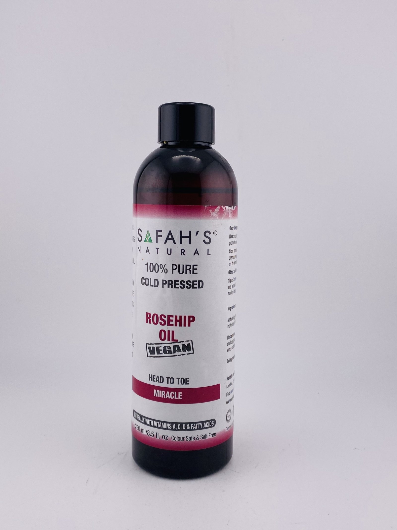 SAFAH’S NATURAL 100% Pure Cold‑Pressed Rosehip Oil VEGAN (250 ml / 8.5 fl oz) is a vegan, all‑natural botanical oil extracted from rosehip seeds using a cold‑pressed method to retain its nutrients and beneficial compounds. It’s prized in natural skincare for its hydrating and regenerative properties — helping to moisturize skin, support repair of scars and fine lines, promote a healthy glow, and improve overall skin texture. It’s also used on hair and nails for nourishment and softness, and is free from synthetic additives, making it suitable for daily use in clean beauty routines.