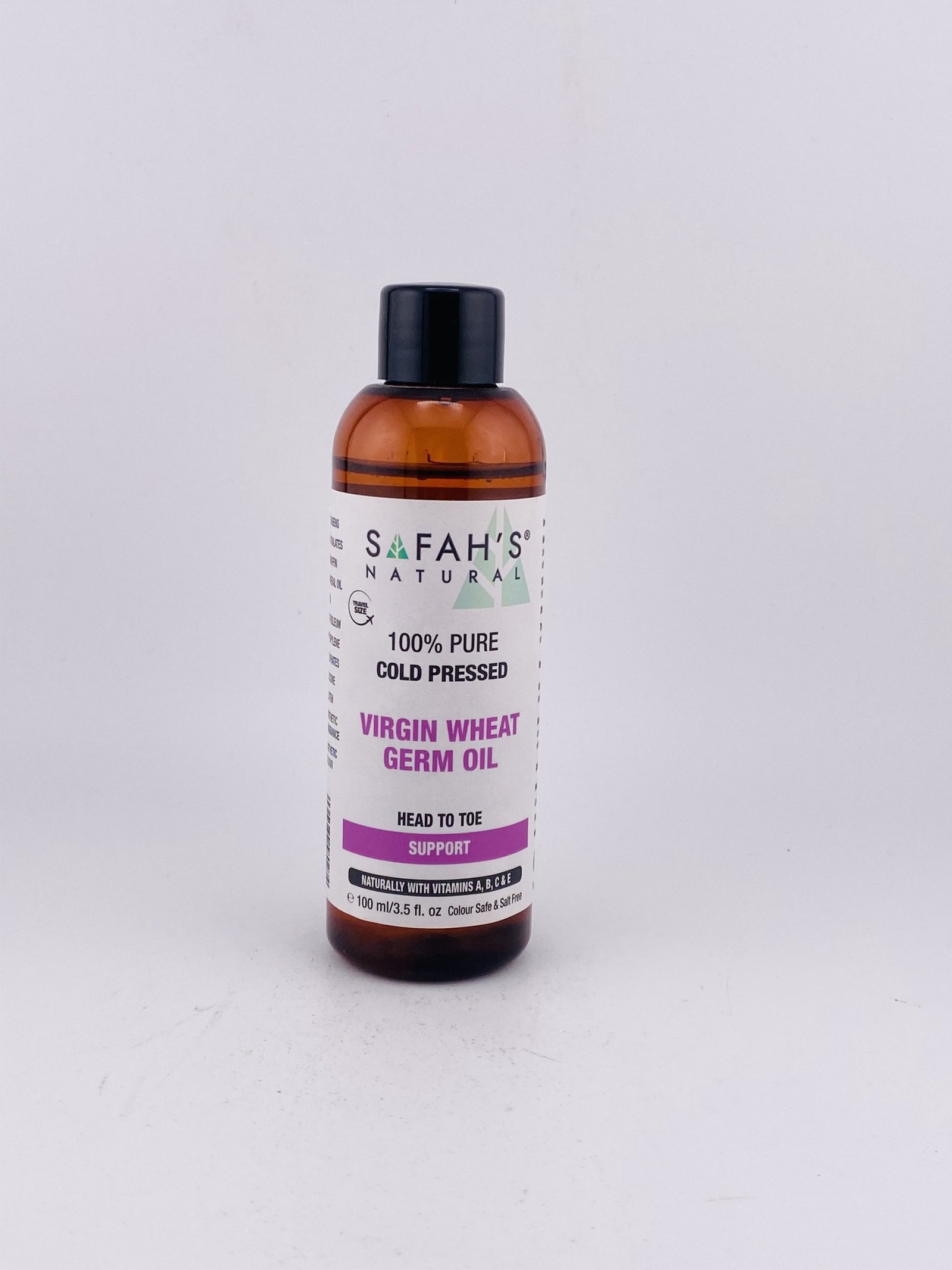 SAFAH’S NATURAL 100% Pure Cold Pressed Virgin Wheat Germ Oil (100 ml / 3.5 fl oz) is a vegan‑friendly, all‑natural oil extracted from the germ of wheat seeds using a gentle cold‑pressed process that preserves its nutrients and antioxidants. It’s rich in vitamins A, B, C and E and essential fatty acids, making it deeply nourishing for dry or damaged skin and hair. People use it to help moisturize and soothe skin, support natural repair, improve elasticity, and promote stronger, healthier hair and scalp, all without synthetic additives.