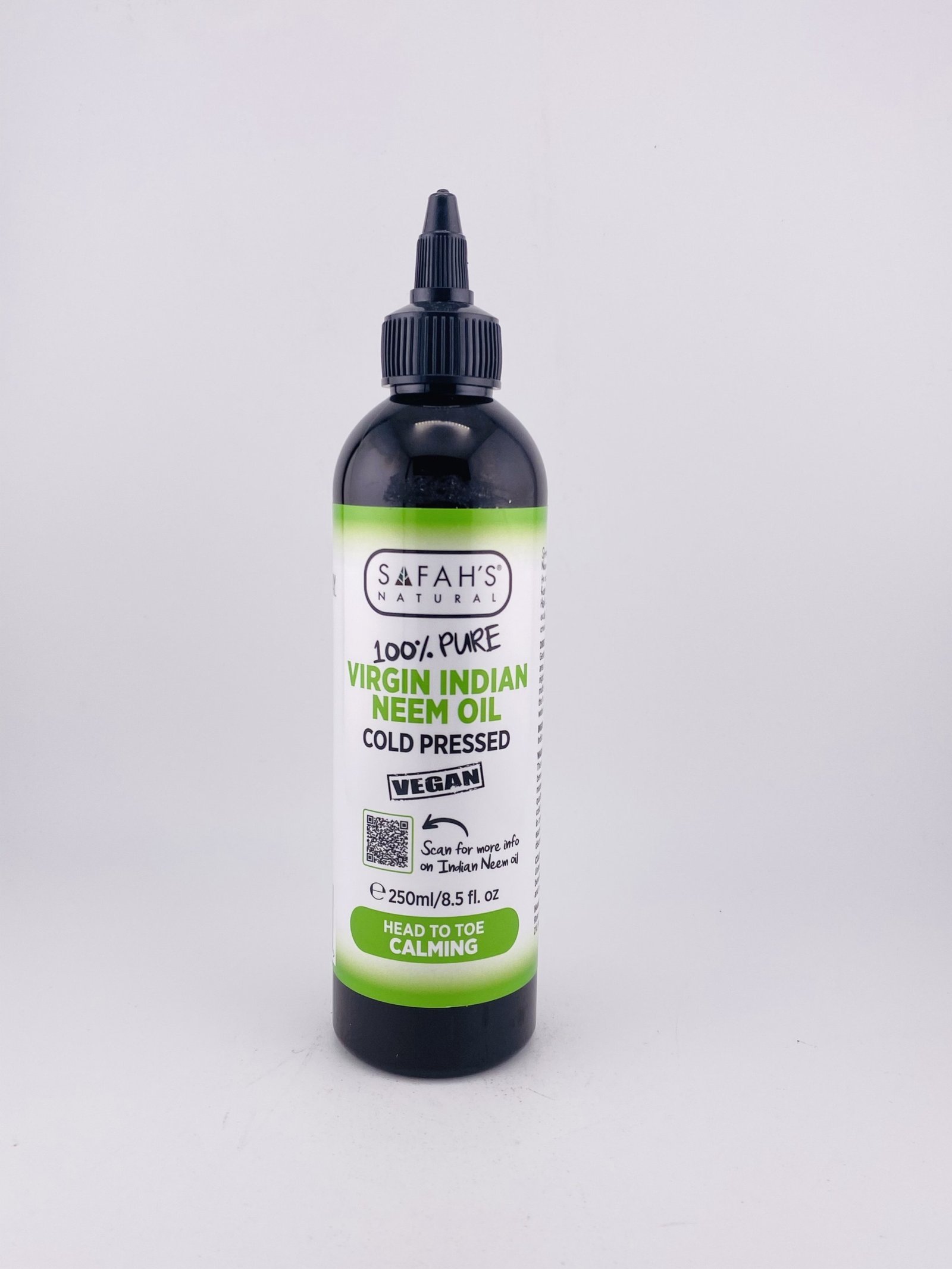 SAFAH’S NATURAL 100% Pure Virgin Indian Neem Oil Cold Pressed VEGAN (250 ml / 8.5 fl oz) is a vegan, all‑natural cold‑pressed botanical oil extracted from Indian neem seeds that retains its nutrients and beneficial compounds. It’s traditionally used in skin and hair care to help moisturize dry skin, support a healthier scalp, and address issues like dandruff or irritation, thanks to neem’s rich natural profile. It’s also known for its soothing and conditioning properties without synthetic additives, making it suitable for natural self‑care routines.