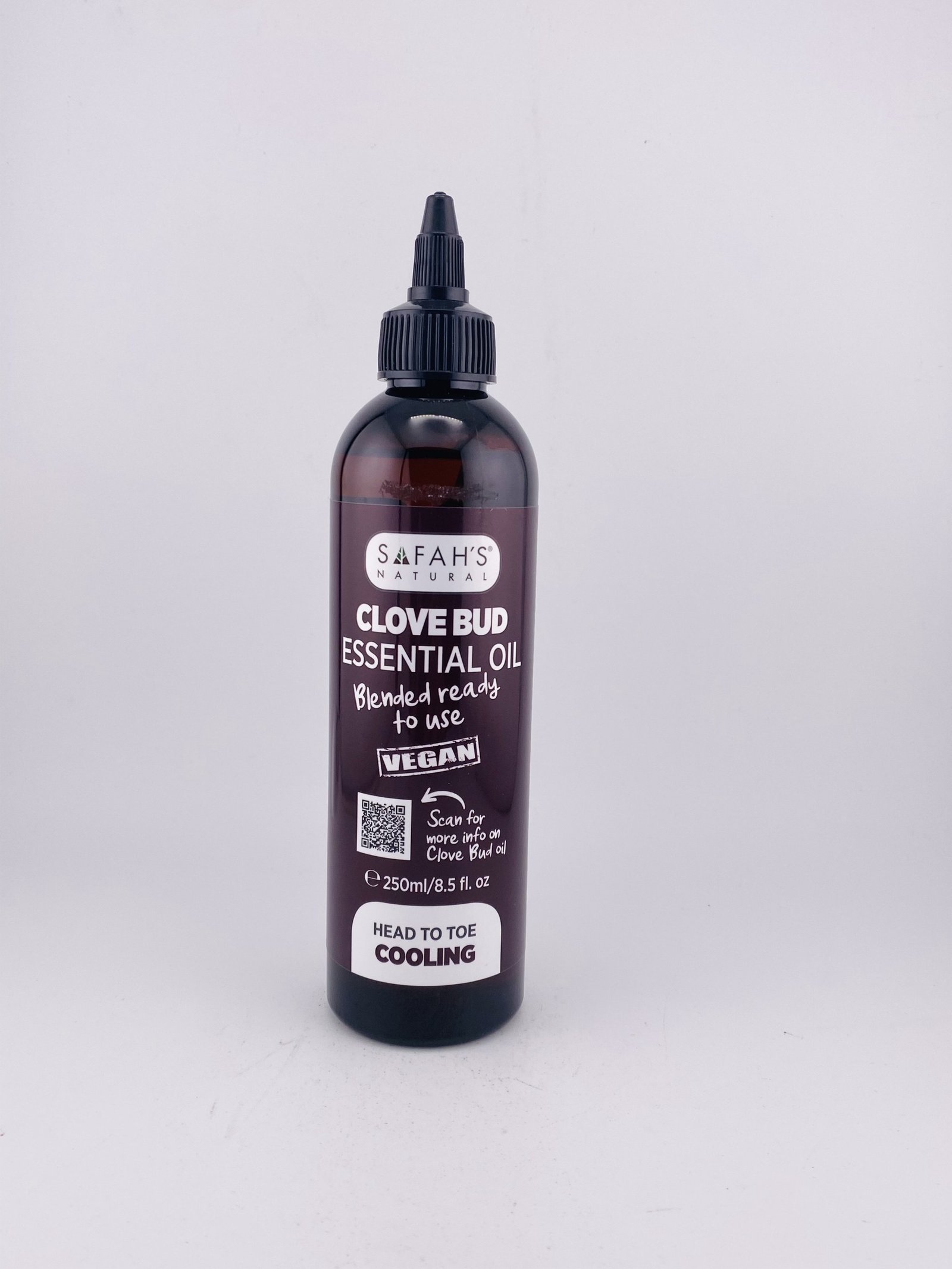 SAFAH’S NATURAL Clove Bud Essential Oil VEGAN (250 ml / 8.5 fl oz) is a vegan, 100% natural essential oil distilled from clove buds. It has a warm, spicy aroma and is known for its antioxidant and invigorating properties. Commonly used in aromatherapy to help uplift and energize, and (when properly diluted) in topical blends to support circulation and provide a warming sensation. It’s free from synthetic additives and designed for natural wellness routines.