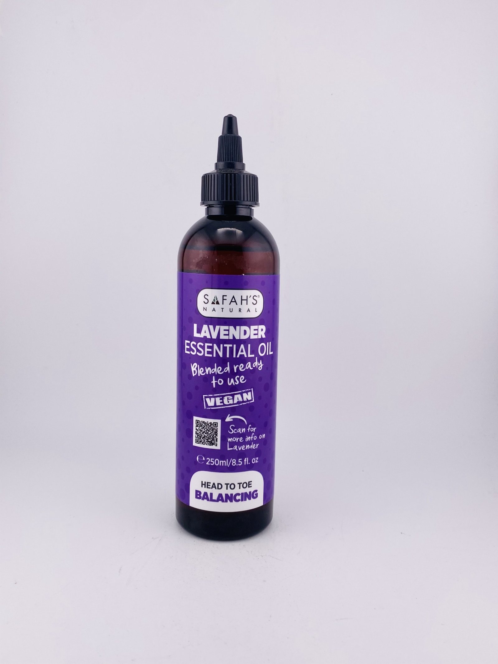 SAFAH’S NATURAL Lavender Essential Oil VEGAN (250 ml / 8.5 fl oz) is a vegan, 100% natural essential oil distilled from lavender flowers and blended for ready‑to‑use wellness and beauty purposes. It’s known for its soothing, calming aroma that makes it popular in aromatherapy to help relax the mind, ease stress, and promote a sense of calm. In skincare and hair care, it’s often used (diluted) to support skin hydration, calm irritation, and enhance hair and scalp health. The formula is free from synthetic additives and focuses on pure plant‑derived benefits for natural self‑care routines.
