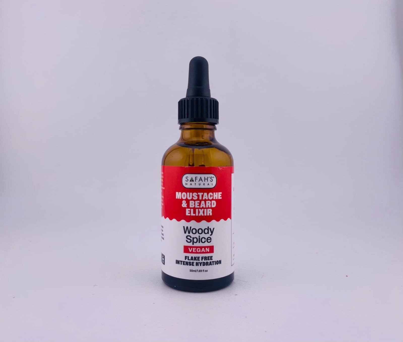 Safah’s Natural Moustache & Beard Elixir – Woody Spice a vegan beard and moustache oil formulated to deeply hydrate facial hair and skin while providing a rich woody spice scent and a flake‑free finish.