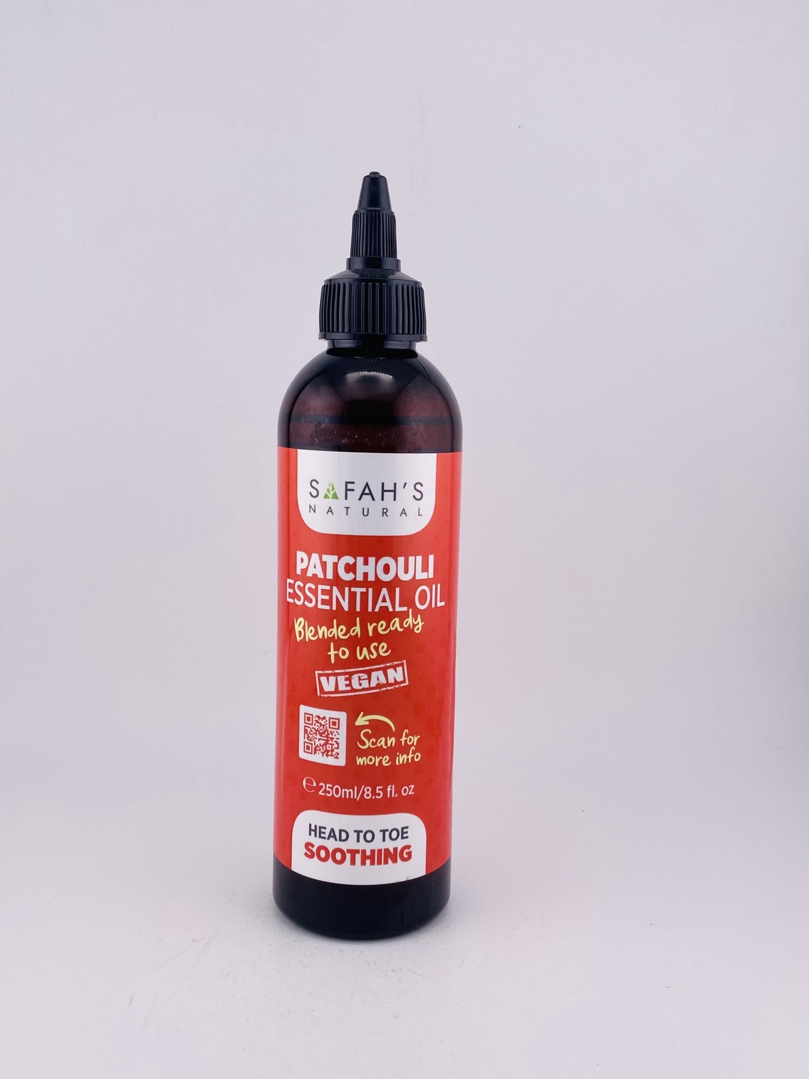 SAFAH’S NATURAL Patchouli Essential Oil VEGAN (250 ml / 8.5 fl oz) is a vegan‑friendly, 100% natural essential oil distilled from patchouli plant leaves. It has a deep, earthy, woody aroma that’s popular in aromatherapy for helping promote calm, grounding and emotional balance. When diluted into a carrier oil, it’s also used in skincare and wellness routines to support skin nourishment and hydration, refresh the senses, and enhance natural self‑care rituals without synthetic additives.