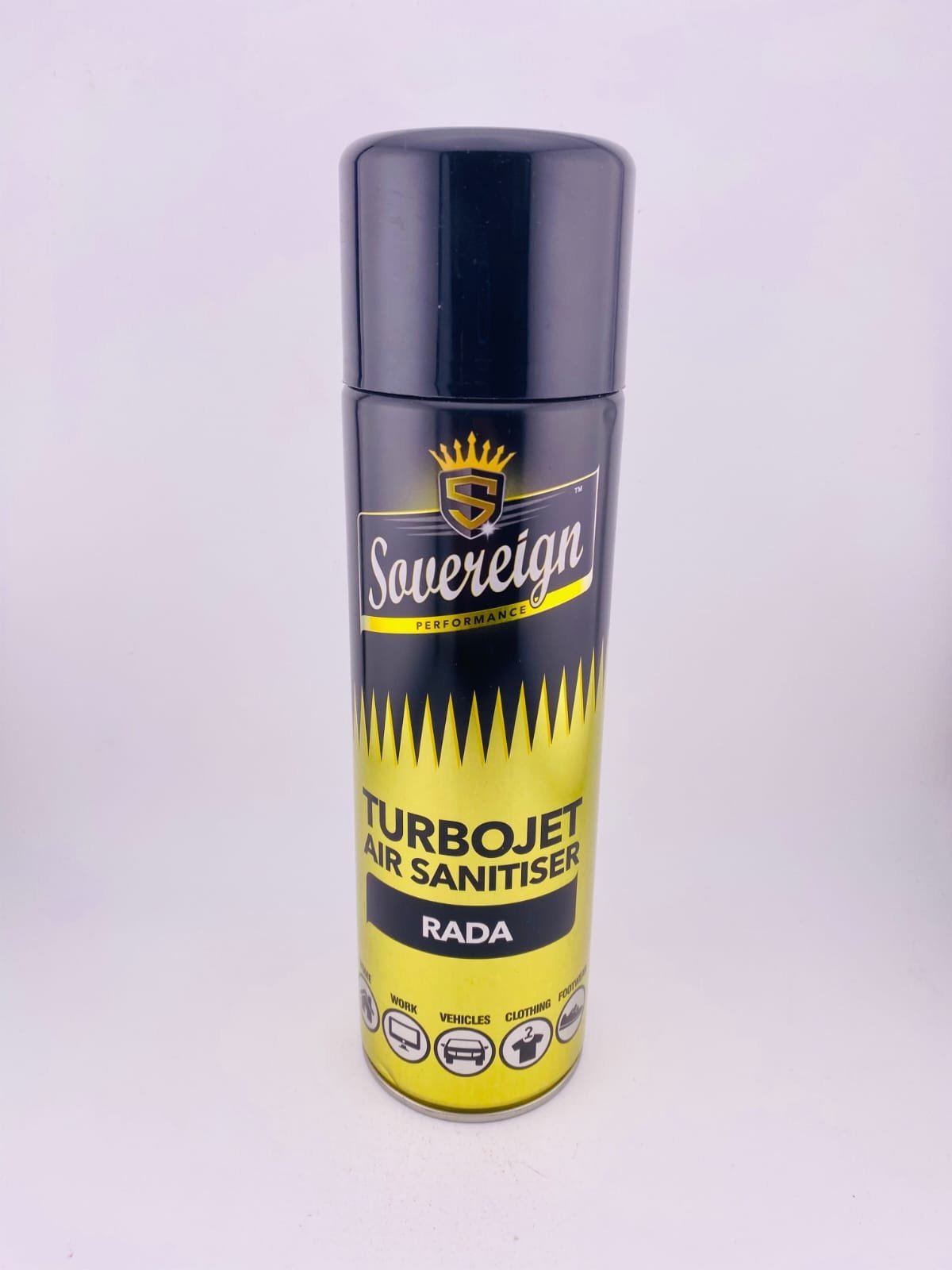 The Sovereign TURBOJET Air Sanitiser Rada is a high‑performance aerosol air sanitiser and odour neutraliser that quickly eliminates unpleasant smells in enclosed spaces and leaves behind a lasting designer‑inspired Rada fragrance. It uses a turbojet valve to deliver a powerful burst of highly perfumed scent into areas like cars, offices, toilets, and other small or large indoor environments, helping to freshen the air effectively and create a more pleasant atmosphere.
