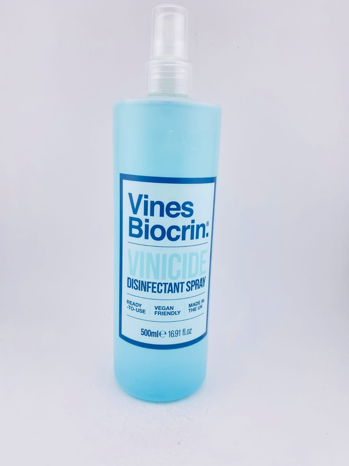 Vines Biocrin VINCIDE Disinfectant Spray is a ready‑to‑use disinfectant spray designed to clean and disinfect in one step. It has bactericidal, virucidal, and fungicidal action, meaning it’s formulated to kill a broad range of bacteria, viruses, and fungi on smooth surfaces and equipment like plastic, stainless steel, glass, and ceramics. This makes it suitable for use in salons, healthcare settings, and other environments where hygiene is important — you simply spray the surface, let it work, then wipe or let it air dry.