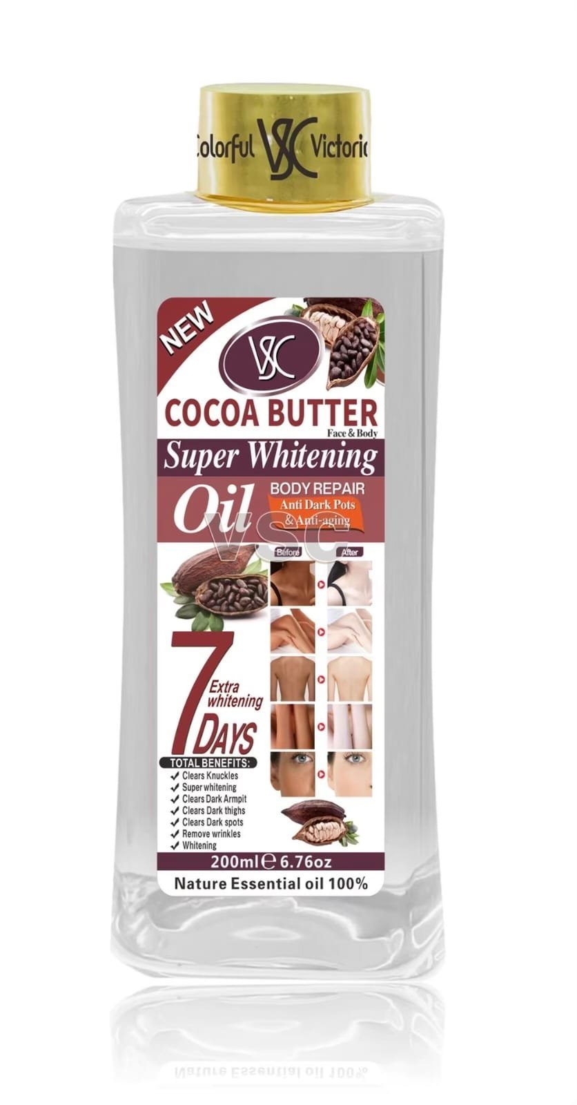 VSC New Cocoa Butter Super Whitening Oil Body Repair (200 ml / 6.76 fl oz) is a body and face care oil formulated with cocoa butter and nourishing oils that deeply hydrate and soften the skin. It’s marketed to help brighten and even out skin tone, reduce the look of dark spots or pigmentation, and combat signs of aging like fine lines while supporting overall skin repair and a smoother, more radiant complexion with regular use.